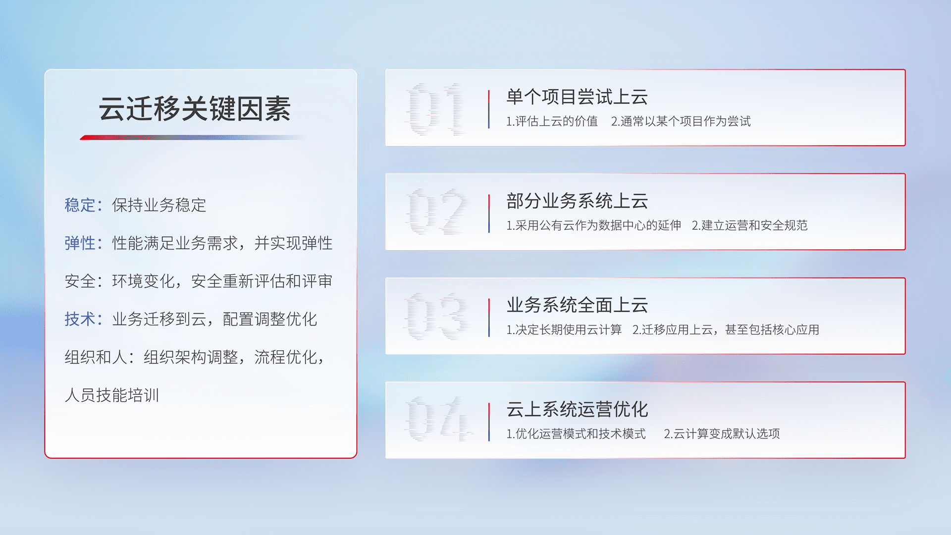 结合实际业务,,,,从规划设计、、、云平台选型、、、云原生改造、、、、数据迁移、、集成交付,,迁移全过程为客户识别最佳上云路径,,做好风险识别管理,,,,设计网络架构、、、身份权限、、、、安全审计合规、、操作审计、、日志审计、、、监控告警策略、、、、多站点容灾设计等,,,,对云上基础设施进行整体规划,,提升IT治理水平,,,以满足弹性、、、、高可用、、高性能的需求。。